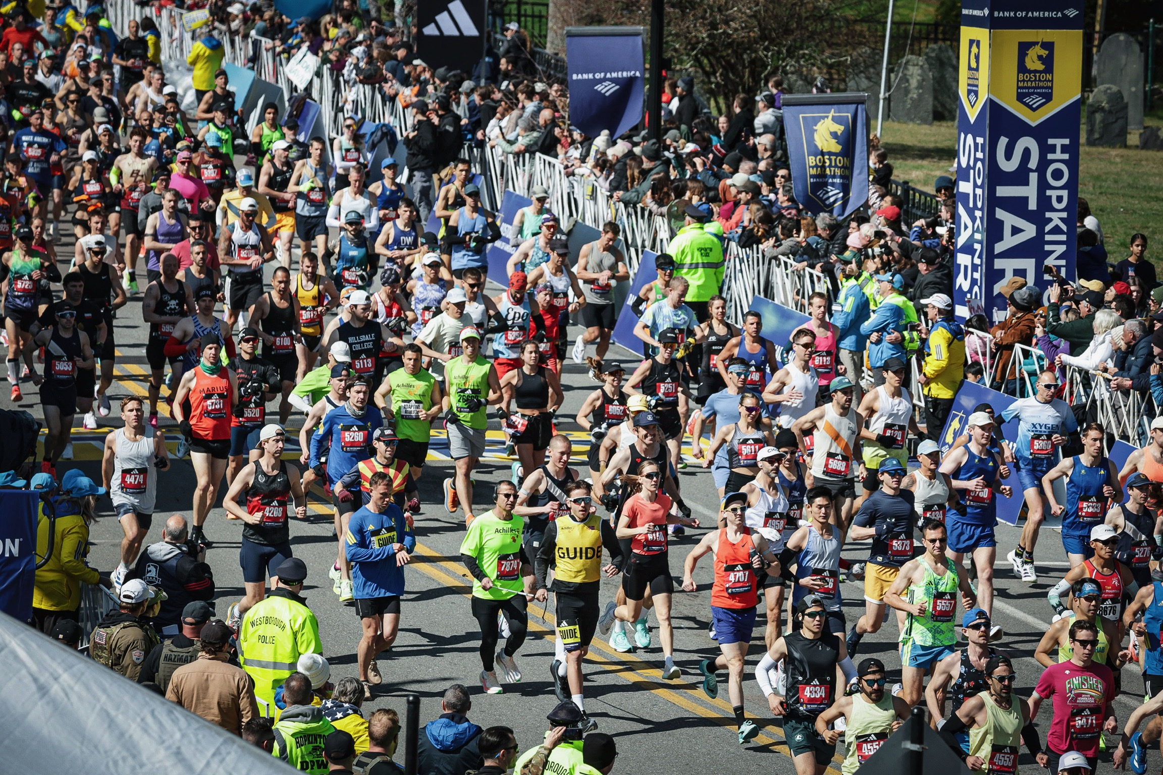 The sun was shining. The flags were blowing in the tailwind. I put my sunglasses on immediately in the corral. The national anthem was sung. The plane flew by, missed its timing a little, but it was still epic to watch. The gun went off, and we were on our way from Hopkinton to Boston.