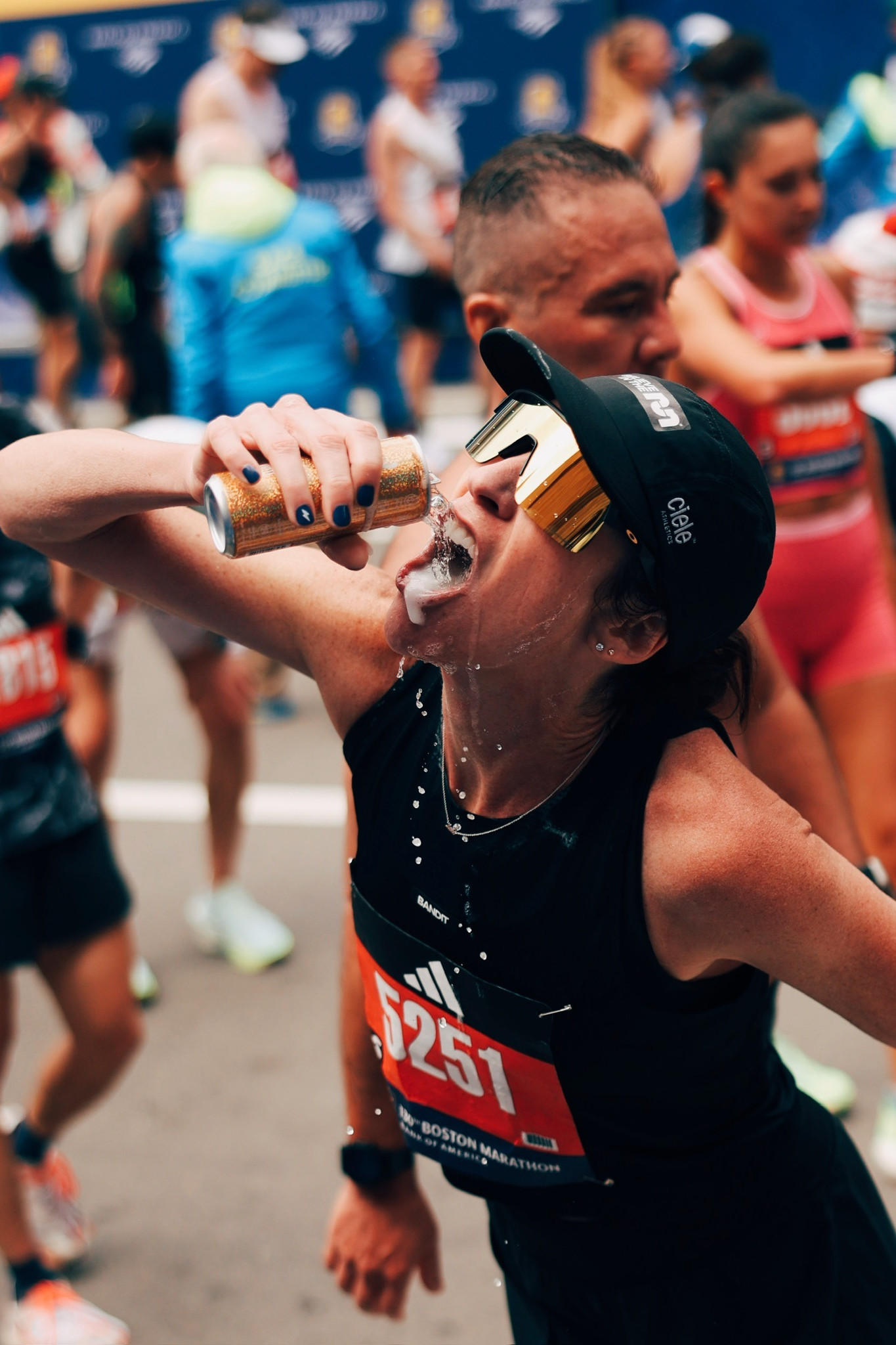 I crossed that finish line with the most massive smile ever. My face actually hurt from smiling so much. I stopped my watch and saw who was waiting for me, but Meg. The best finish line greeting. Thomas handed me a can of prosecco, which I immediately opened like Emma Bates’s iconic Modelo finish two years earlier.