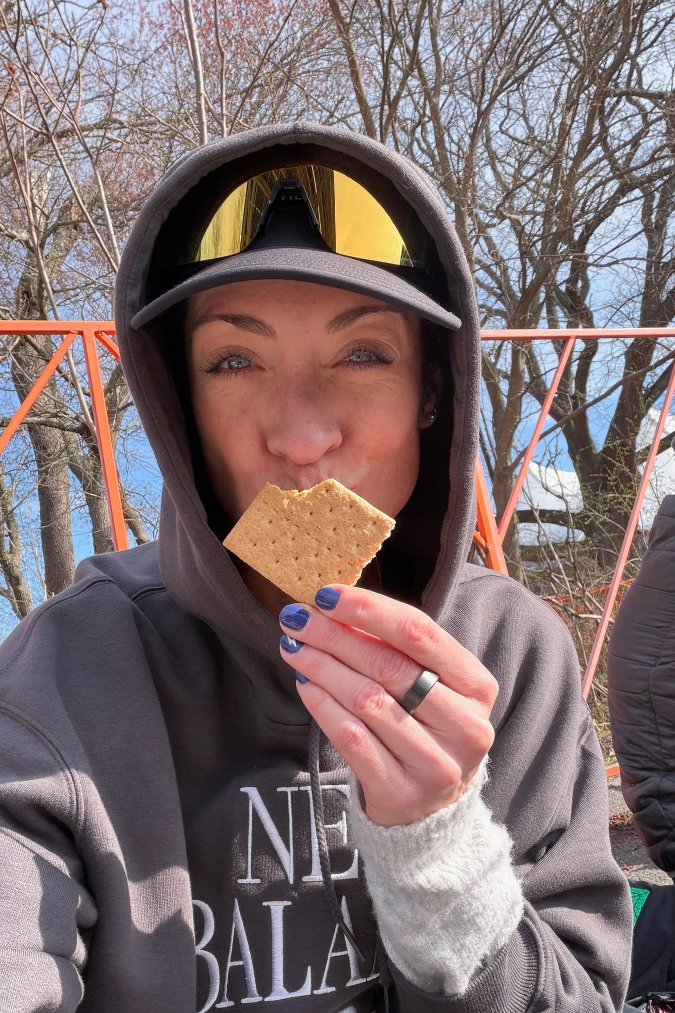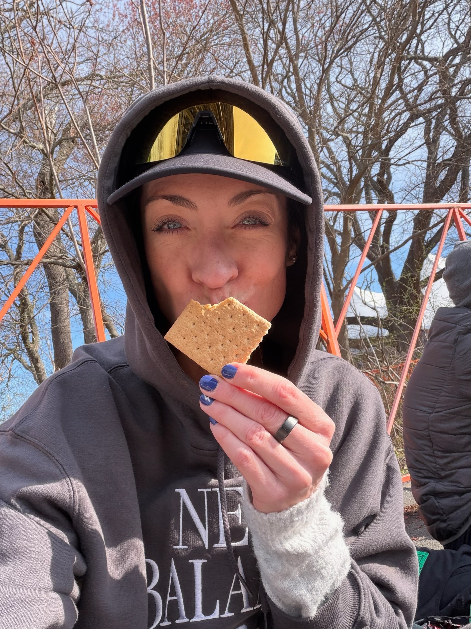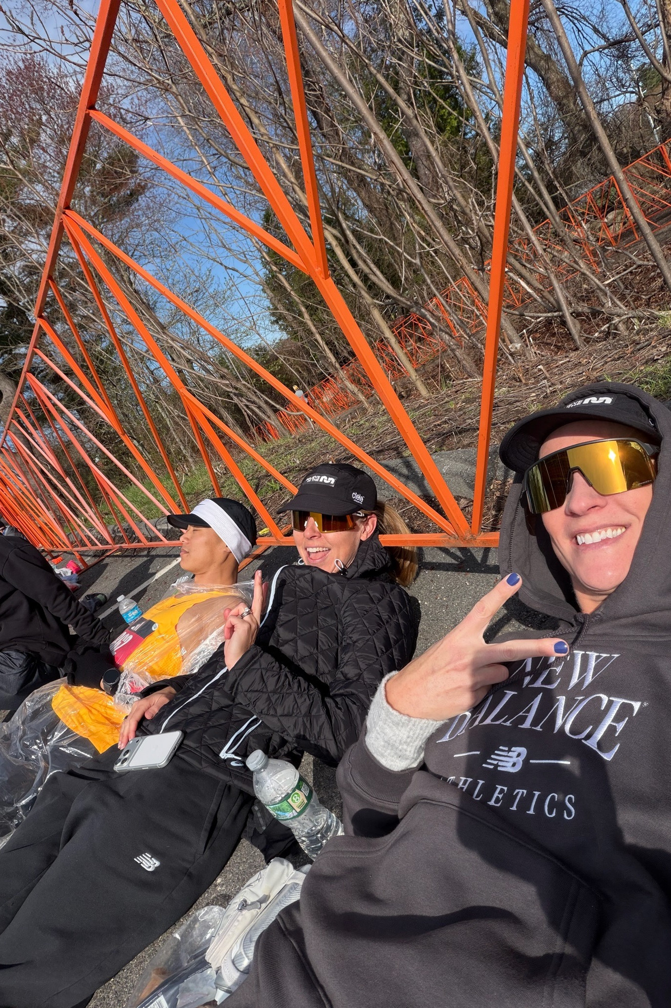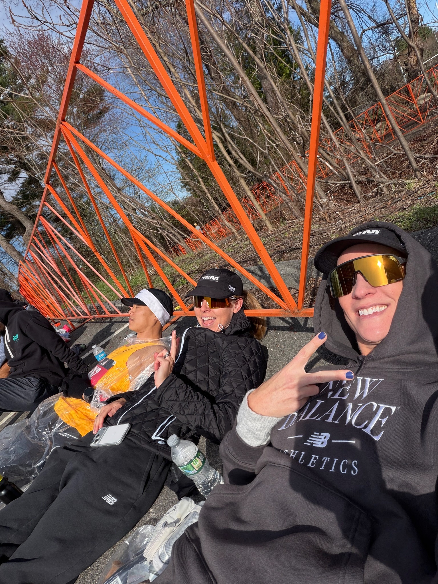 We got to the Athlete’s Village around 7:40 am, so we have about 90 minutes to lounge. We found a smaller area to wait (thanks for the intel, Ben) that had no lines at the bathrooms and plenty of dry places to sit and lie down. We laughed a lot. I observed all the different pre-race nutrition options runners were consuming. And I ate my second breakfast at 8 am: another Maurten solid bar + 4 graham crackers.