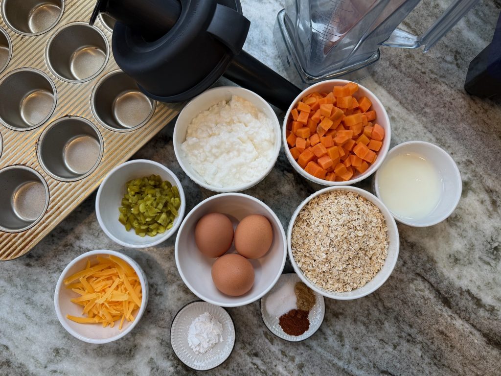 - In a high-powered blender, combine sweet potatoes, eggs, cottage cheese, oats, milk, baking powder, chili powder, cumin, and salt. Blend well.