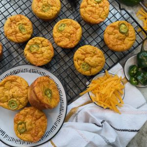 - Grease a muffin tin. Pour batter evenly into muffin tins. (You can top with more cheese and jalapenos, if desired.)