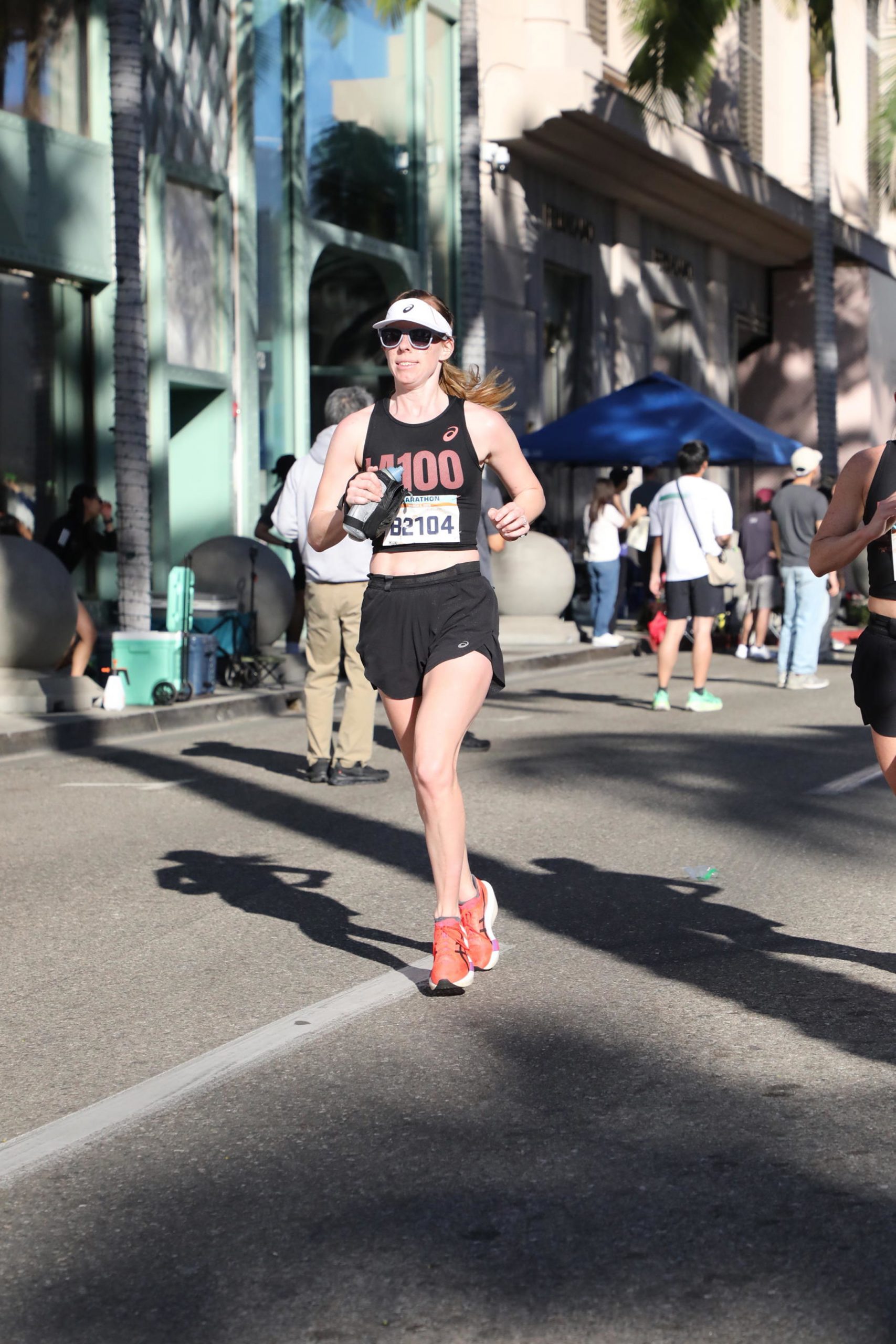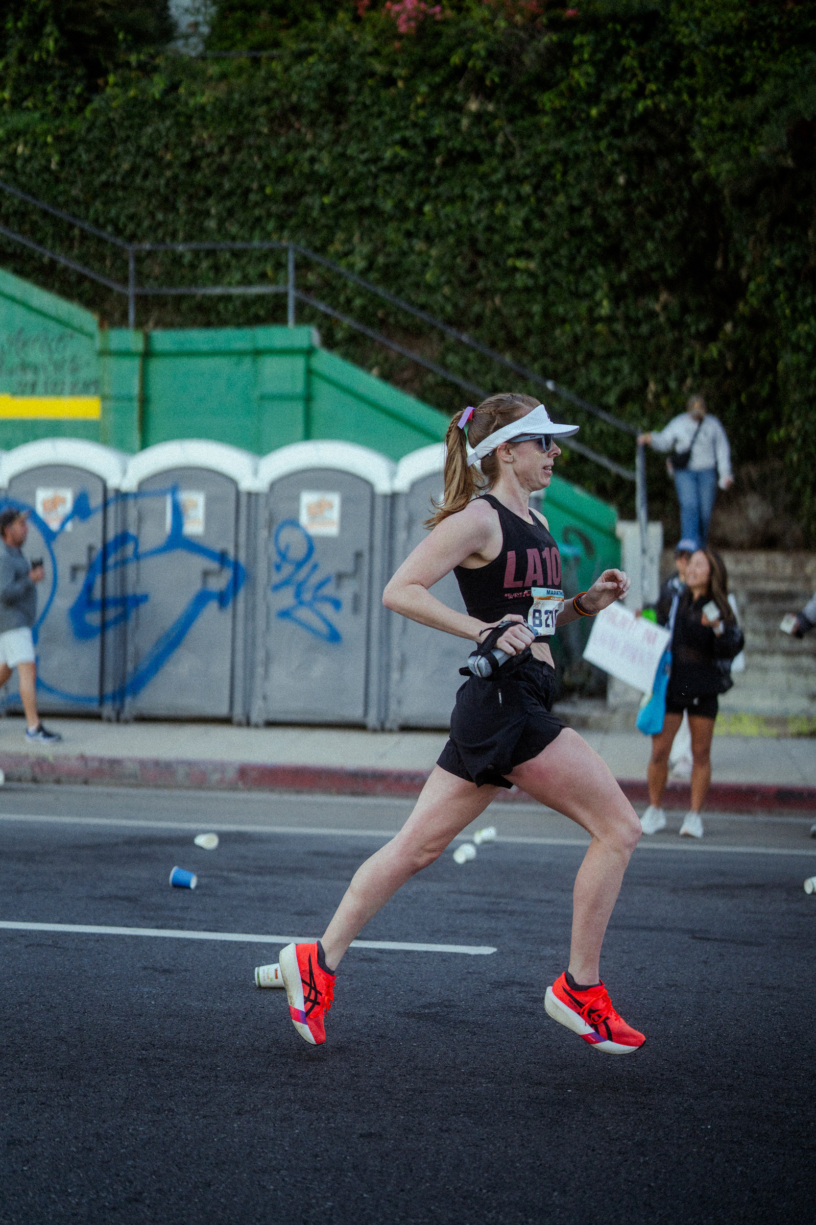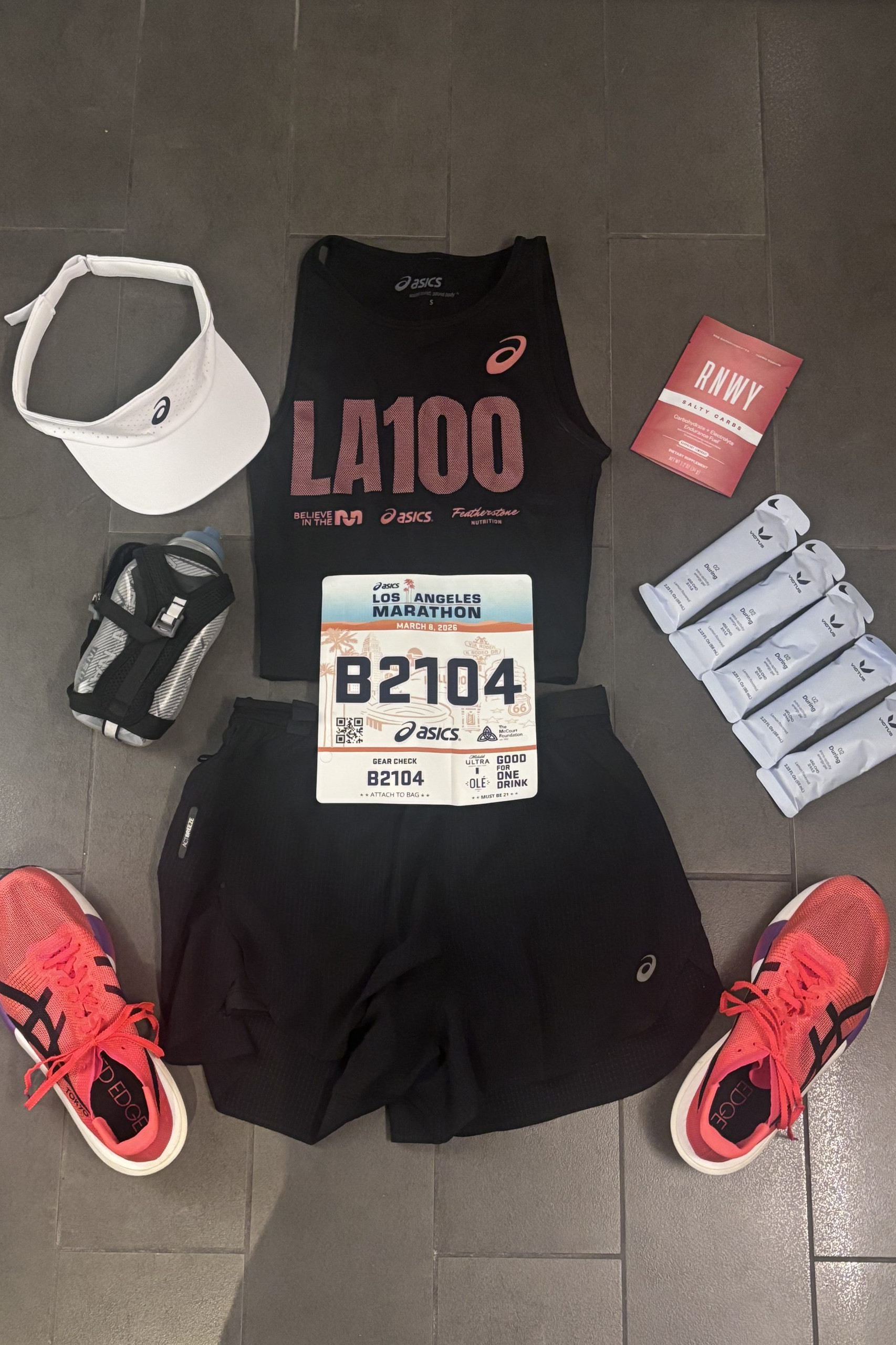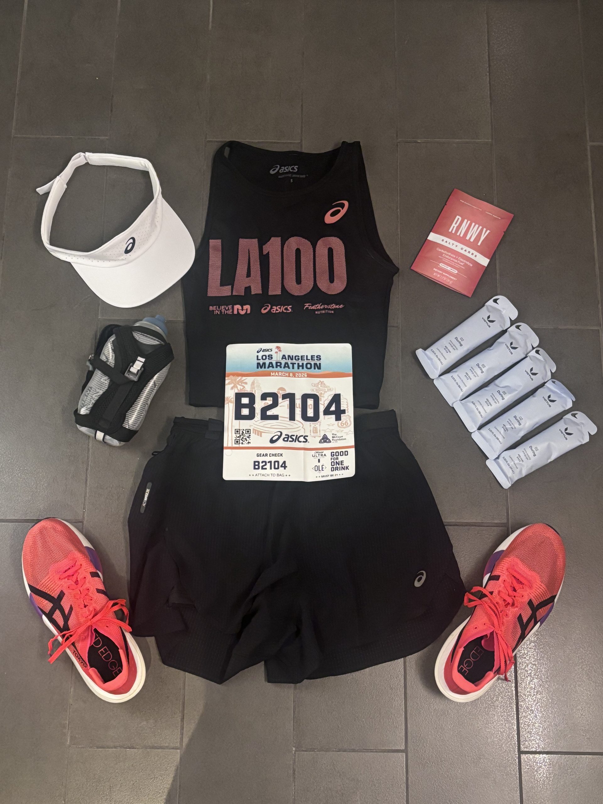 I also wore the ASICS Metarun split shorts and a white ASICS visor. The shorts were super comfortable, though I struggled a bit fitting my larger gels into the pockets. I ended up putting one gel in the back zipper pocket, my first gel in my handheld bottle, and the rest lined up in the front of my sports bra—which actually worked really well.