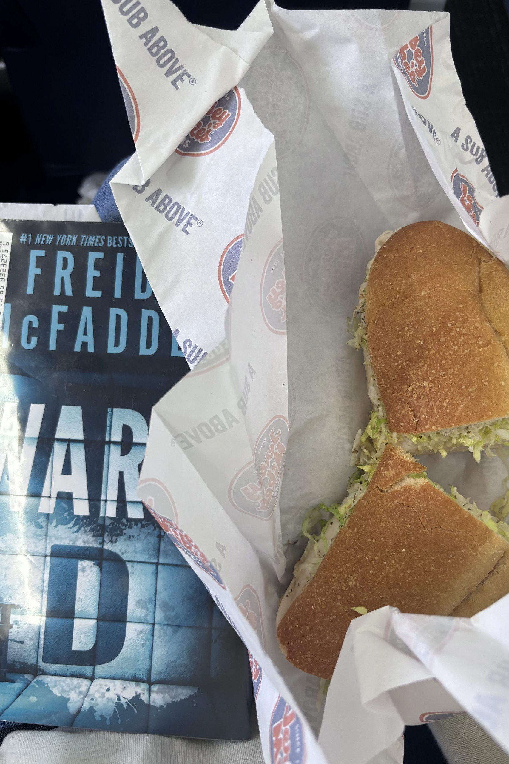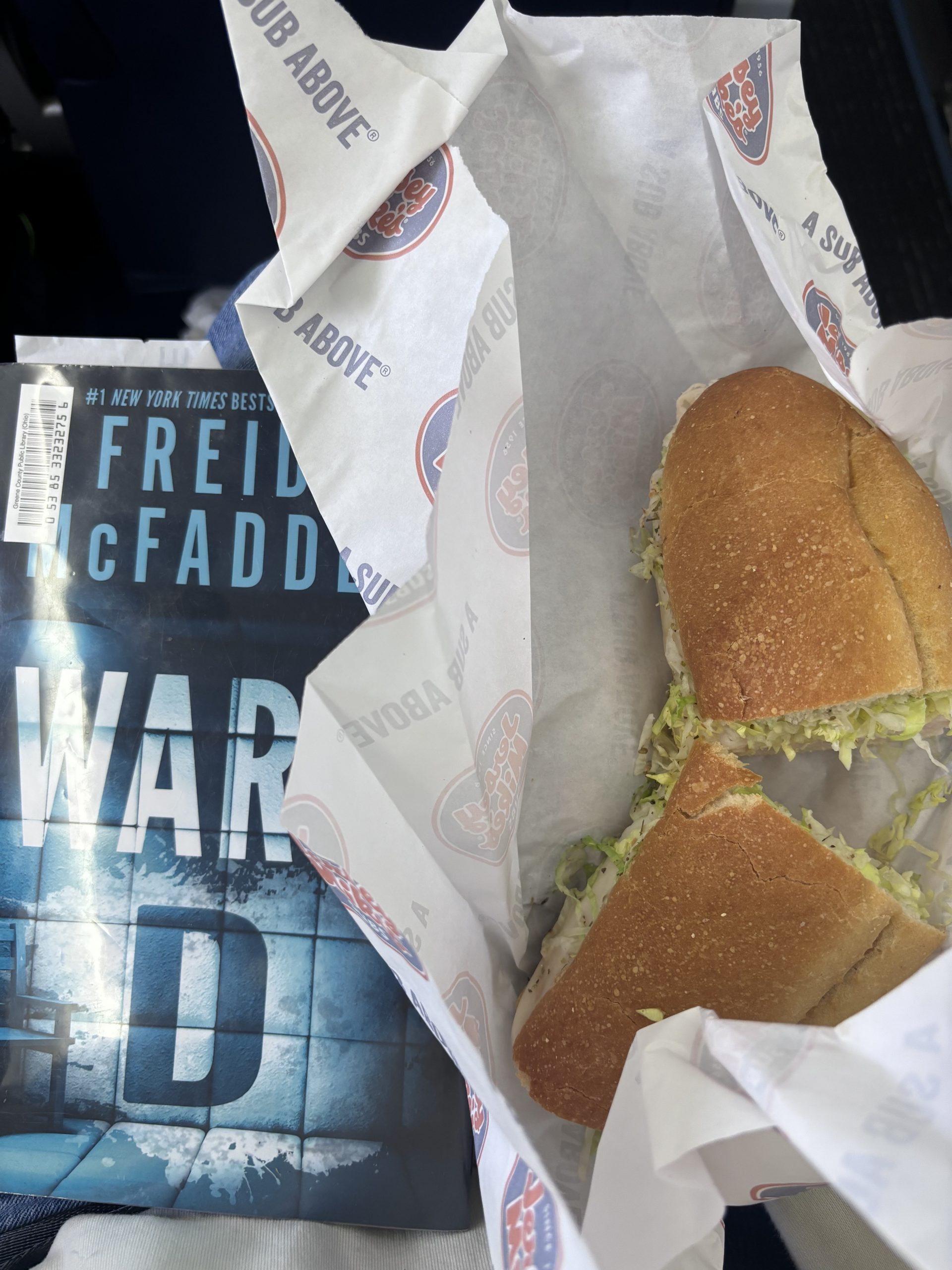 Cinnamon sugar bagel bake, mini Gatorade, Jersey Mike’s turkey and provolone sub, apple juice and Biscoff cookies on the plane, Jimmy John’s Beach Club, mini Dr Pepper and pretzels on the plane, and two servings of Swedish Fish.