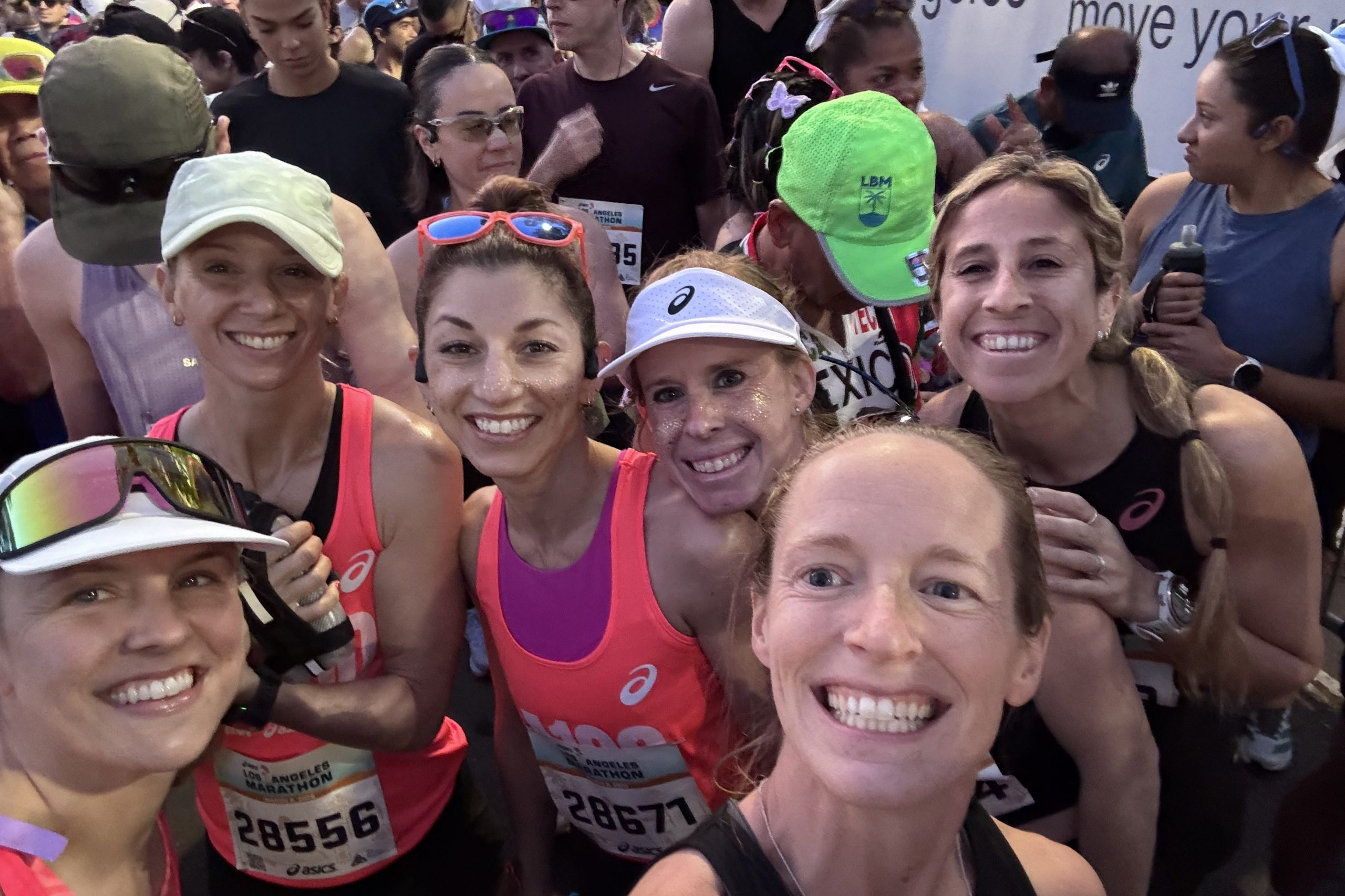 Around 6:20 AM, we headed to the corrals. A group of the LA 100 women sat together on the ground, chatting, making last bathroom stops, taking our final pre-run gels, and laughing way too hard. Those 15 minutes before the race were probably the most relaxed I’ve ever felt before a marathon—and I have those six women to thank for that.